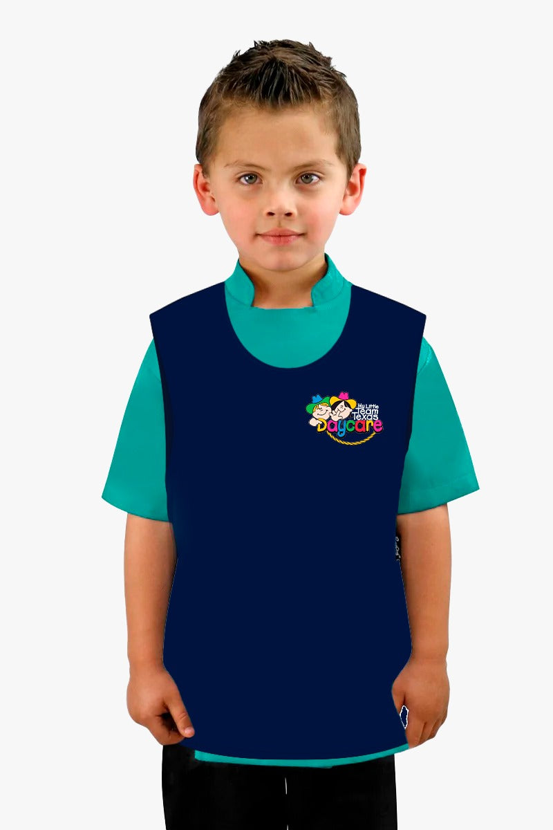 This is a children's school apron, designed for young students in a daycare or preschool setting. The apron is navy blue with a colorful embroidered logo on the left chest that reads "My Little Team Texas Daycare". The apron is sleeveless, providing comfort and ease of movement for active children, and is ideal for use in educational or daycare environments.